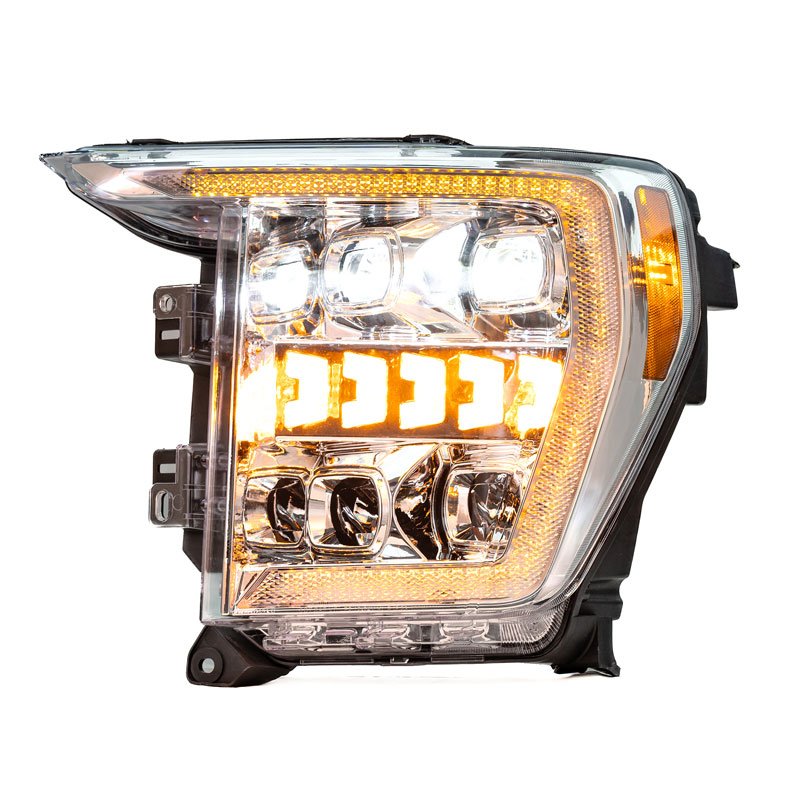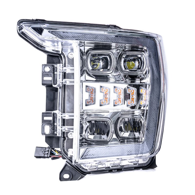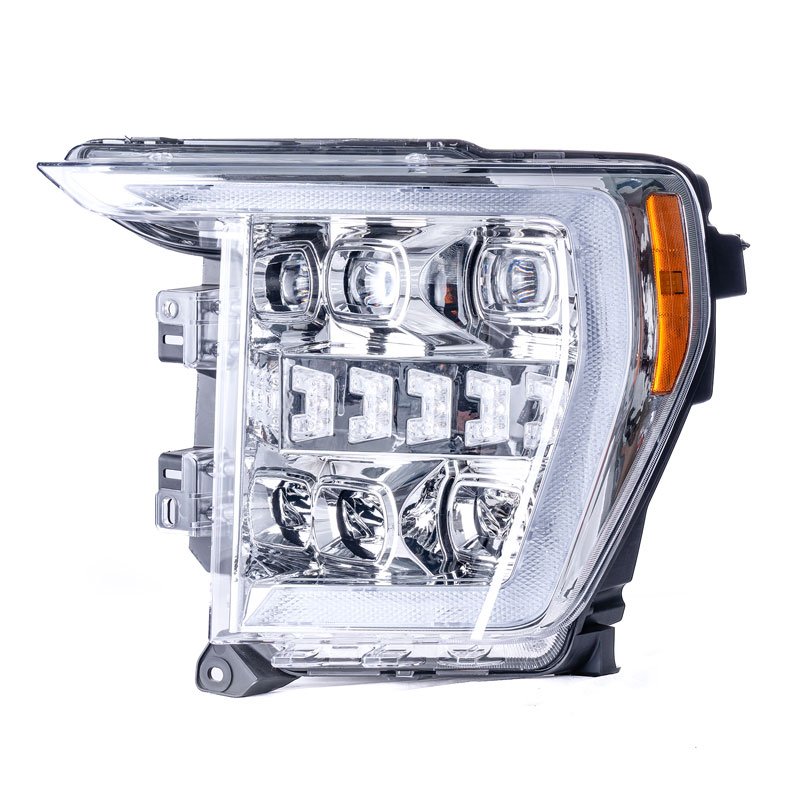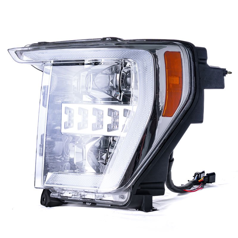Designed specifically for Ford F150 2021-2023, this fully sealed LED headlight assembly offers a plug-and-play style replacement. Matching factory wiring allows for quick setup without drilling or modification, making it easy to upgrade your vehicle’s lighting system. The all-in-one design integrates high beam, low beam, parking light, turn signal, and daytime running light into a single housing, powered by premium CREE LED chips that deliver stable brightness, fast response, and consistent illumination for improved nighttime visibility. Unlike traditional reflector headlights, this assembly features projector-style optical lenses that provide better light control and a more focused beam pattern. The optimized optics reduce scattered light and glare while delivering clearer forward visibility and a cleaner cutoff, helping enhance driving safety without blinding oncoming traffic. Built-in beam adjusters on the rear housing allow precise vertical and horizontal alignment, ensuring the light output can be fine-tuned to meet road conditions and personal driving preferences. Engineered for long-term durability, the headlight is DOT and SAE approved and features an IP67-rated, one-piece sealed housing that resists water and dust in all weather conditions. A scratch-resistant, UV-protected PC lens helps prevent yellowing and aging over time, while the sealed rear cover minimizes moisture intrusion and unwanted noise. Optimized ventilation improves heat dissipation, reducing light decay and extending the overall lifespan of the headlight assembly.